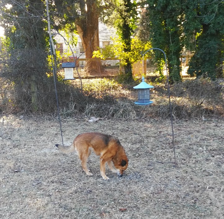 At the peak of the warmth … 27 degrees … I decided the best way to motivate myself was to go on and take the dogs out for our daily romp in the field next door. The idea was a winner with the gang, at least for a while. The smaller dogs, Ace and Yippee, went back to the comparative warmth of the house pretty quickly. The balance settled in to enjoy a frozen feast left by unknown critters passing through the field the night before. Yuck! I try no to think about what that really means!