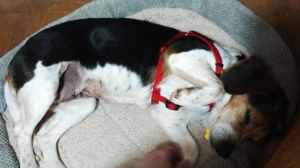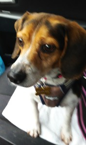 She suggested I meet Lady Bug, a little beagle that was picked up as stray.  Lady Bug had had a major hernia and had been through 2 surgeries to correct things.  She was terrified and it was difficult to get her to eat.   She joined my little ark on the evening of March 6.
