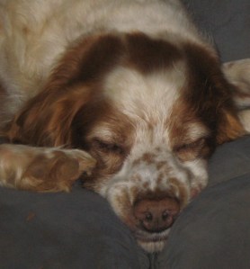 Further away, down at the end of the bed – a deep breathe escapes through a black and white muzzle.
