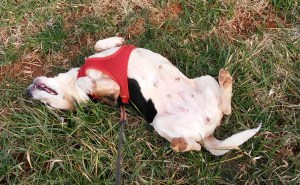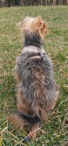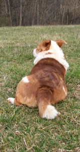 Lettie, the newest member on our Ark, was loving a good roll in the grass.Snickers, our most senior member, took it all in …Yippee, our exuberant little cheerleader, was keeping track of everyone.Katie took a break from poop pile patrol – her favorite thing ever.Maggie, Jackson, Daisy and Lady Bug investigated every blade of grass. Katie is over there in the background.Ace was helping Yippee on surveillance.And not a single one of them would look at the camera!Finally, Daisy gave me her version of a doggie smile. Lady Bug refuses to look at a camera, ever – she thinks it is going to bite her, I think.